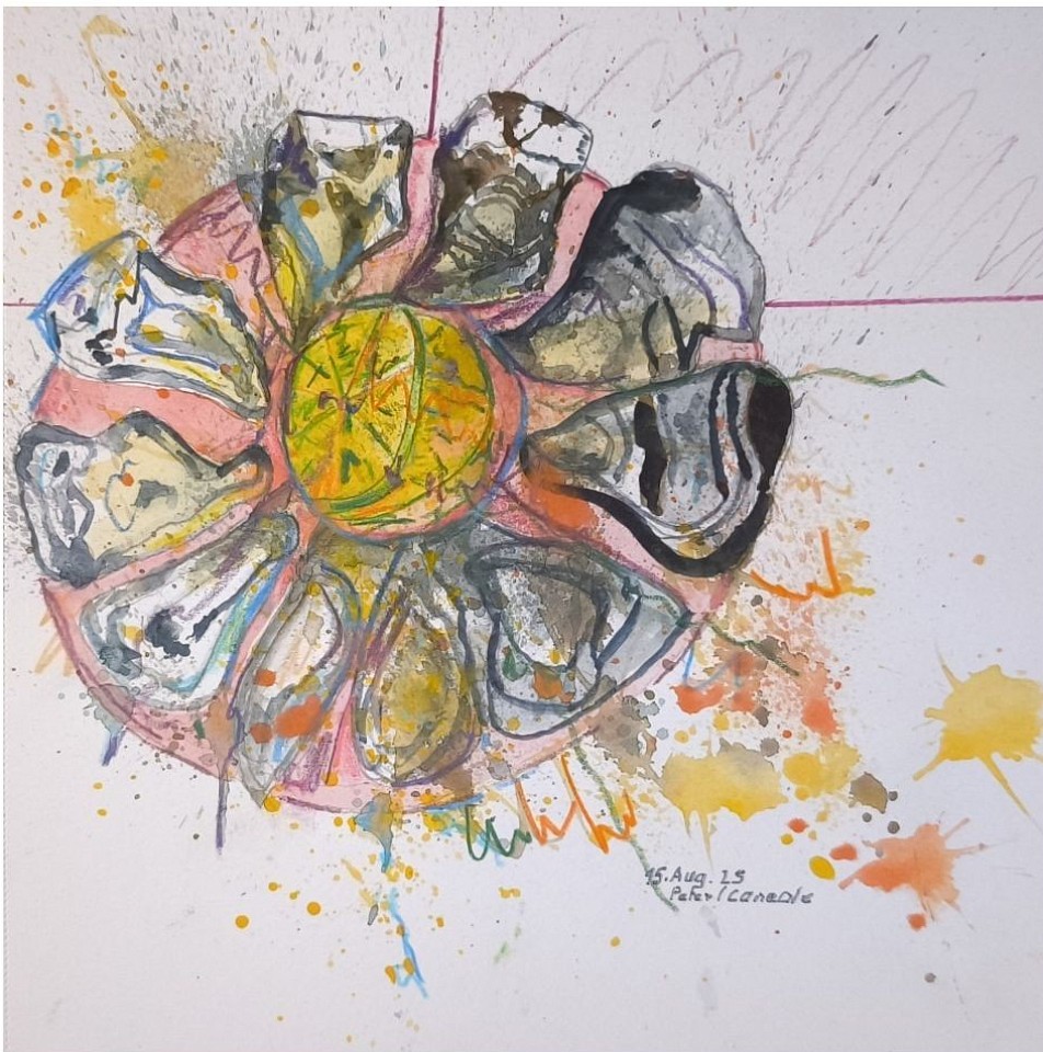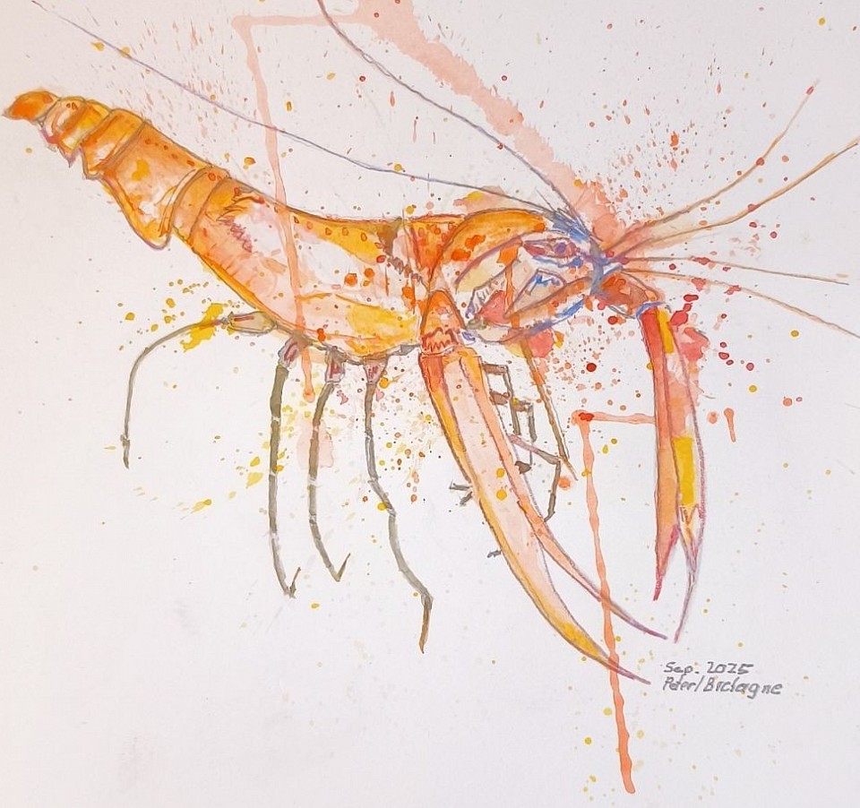 Technik: Aquarellmalerei. Typisch für diese Technik sind die verlaufenden Farben und die spritzenden Farbakzente (Splatter-Technik), die der Darstellung eine dynamische und lebendige Note verleihen. Motiv: Ein großes, orangefarbenes Krebstier mit langen Fühlern und kräftigen Scheren. Signatur: Das Bild ist signiert mit "Sep. 2025 Peter Bretagne".