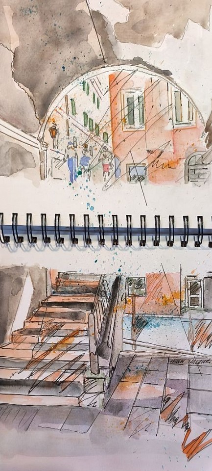 Die Skizze besteht aus zwei Tusche- und Aquarellbildern im Stil von Urban Sketching. Sie zeigen lebhafte Architekturszenen (eine Gasse durch einen Bogen, eine Treppe) mit einer Mischung aus lockeren schwarzen Linien und fließenden, warmen Farben (Rostrot, Braun) im Kontrast zu kühlem Grau, was ihr eine ausdrucksstarke und atmosphärische Wirkung verleiht.